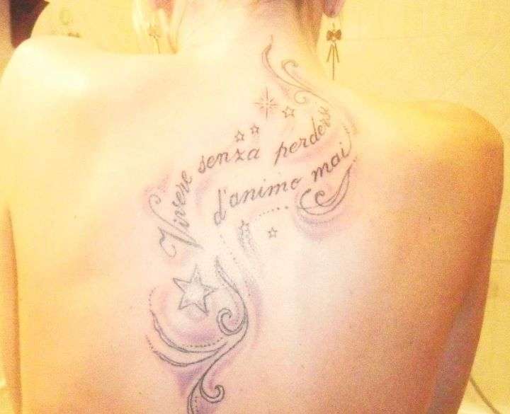 Tatuaggio schiena con ali d'angelo e frase di Vasco