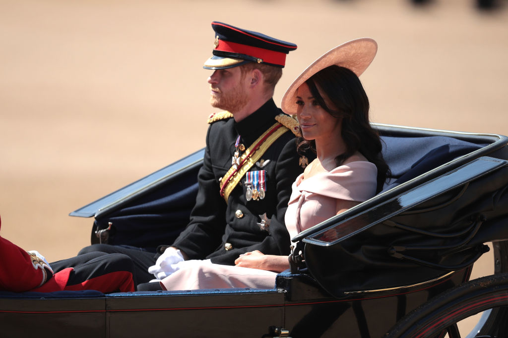 LONDON, ENGLAND - JUNE 09: Prince Harry, Duke of Sussex and Meghan, Duchess of Sussex arrive at The Royal Horseguards during Trooping The Colour ceremony on June 9, 2018 in London, England. The annual ceremony involving over 1400 guardsmen and cavalry, is believed to have first been performed during the reign of King Charles II. The parade marks the official birthday of the Sovereign, even though the Queen's actual birthday is on April 21st. (Photo by Dan Kitwood/Getty Images)
