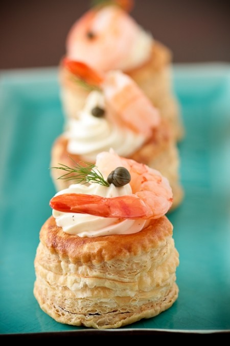 <Farcite i vol au vent con la mousse al tonno e decorate con i gamberetti.
